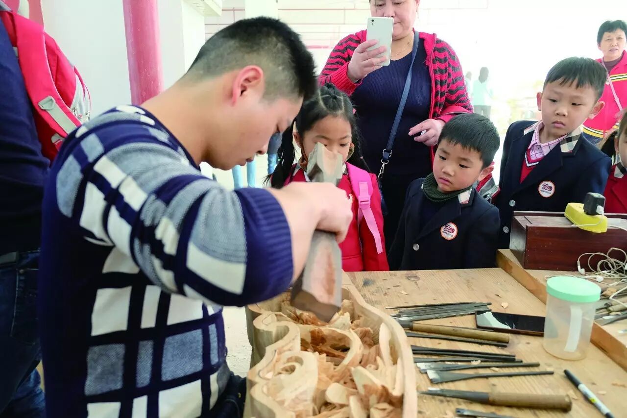 参观中,孩子们被一位老师傅吸引住。他叫林国富,来自仙游县,今年52岁,正专注地在木制构件上绘图。只见铅笔飞快在构件上进行描绘,“是八仙图!”孩子们兴奋地叫出声来。果然,神态各异的八仙形象跃然于木材上。
